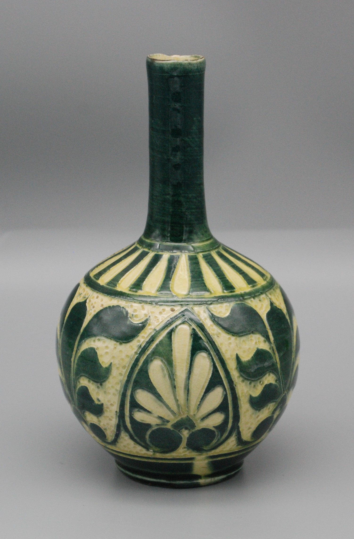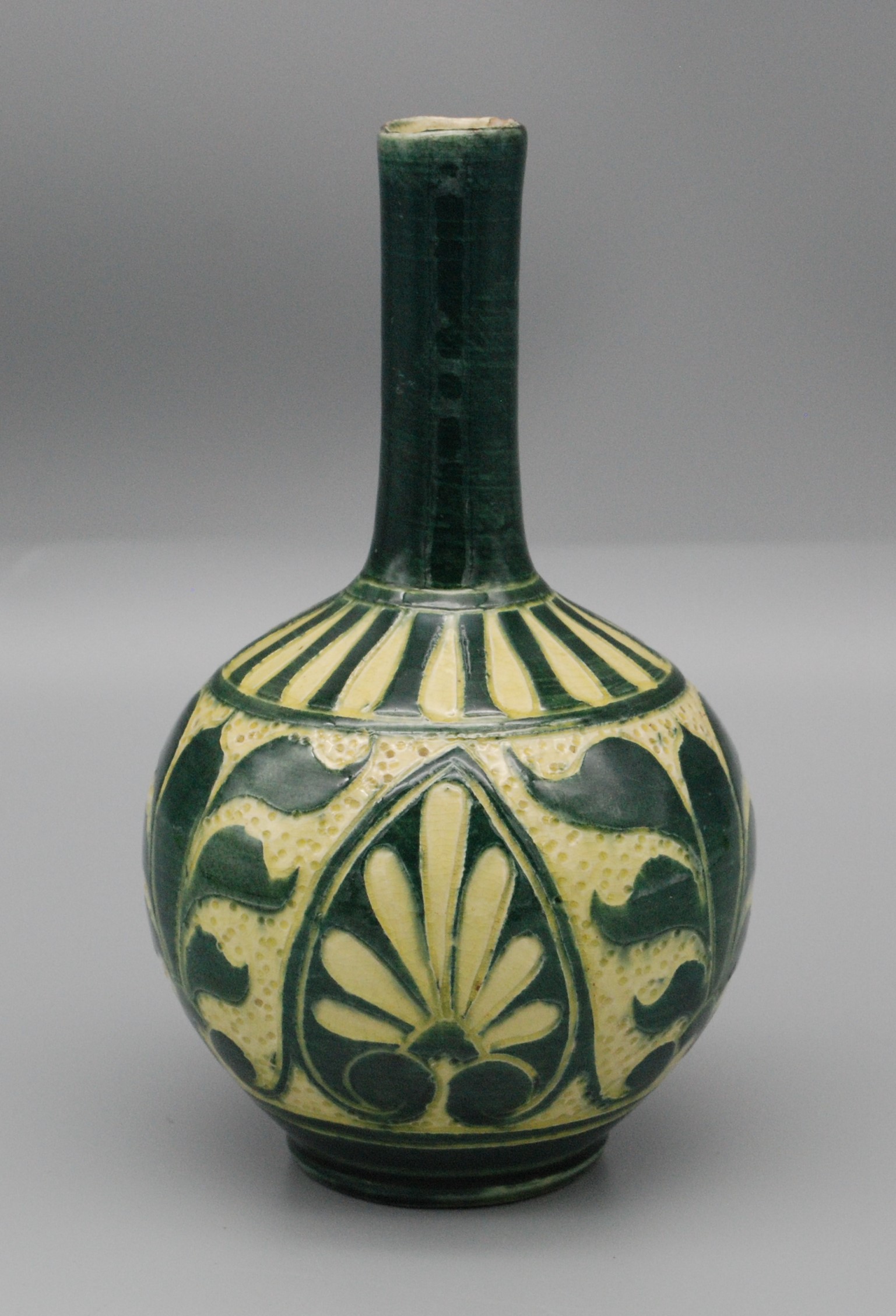 The tactile surface showcases a highly disciplined use of the sgraffito technique, juxtaposing a rich, glossy forest green glaze against a pale, cream-colored stippled ground. The decoration is strictly structured: the shoulder features a bold, radiating striped motif that anchors the base of the neck. The primary body is divided into panels by sweeping, arched green borders that frame stylized, symmetrical botanical and palmette designs. The intricate stippling of the negative space provides substantial depth and texture, typical of Brannam’s best art wares.