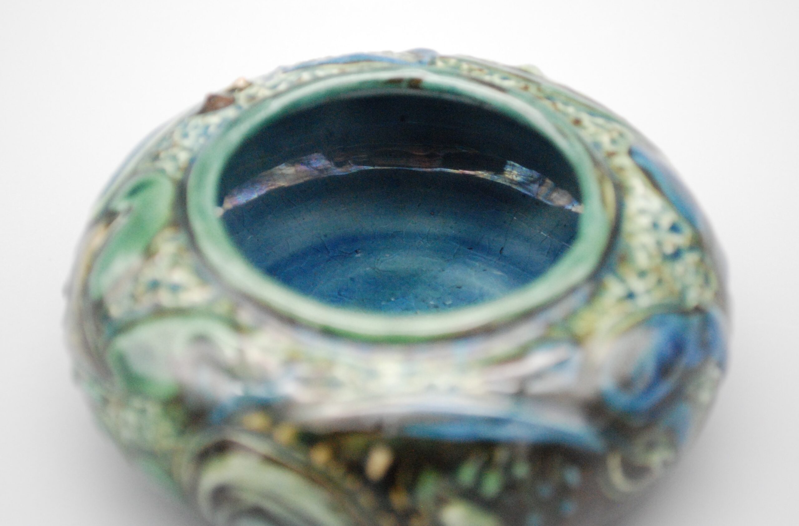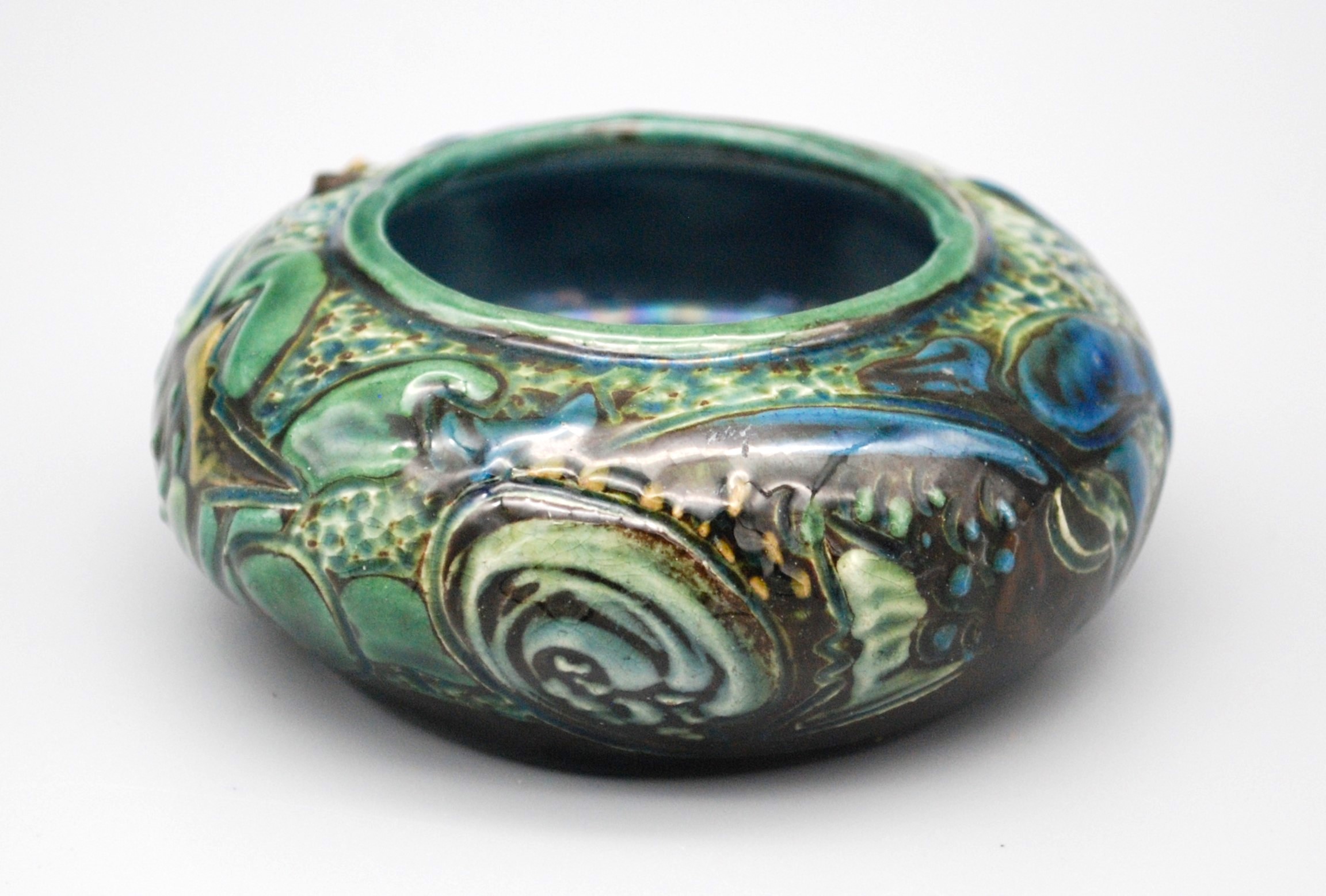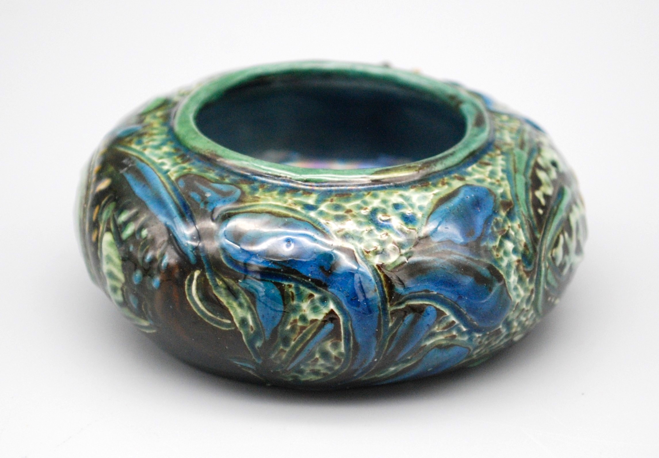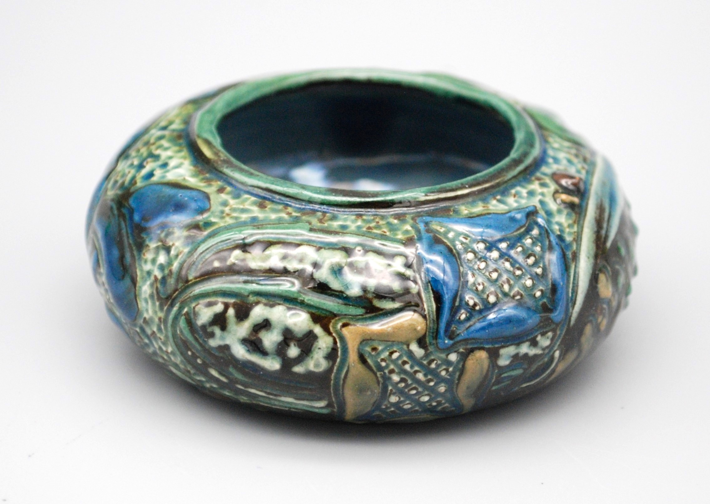 For sale we this delightful and cute little CH Brannam “open salt” decorated with two surprisingly detailed fish dating to 1901. This is the work of Frank Thomas, one of the better known artists for the potter. The fish are surrounded by various colourful waterplants. It is a little gem of a piece.