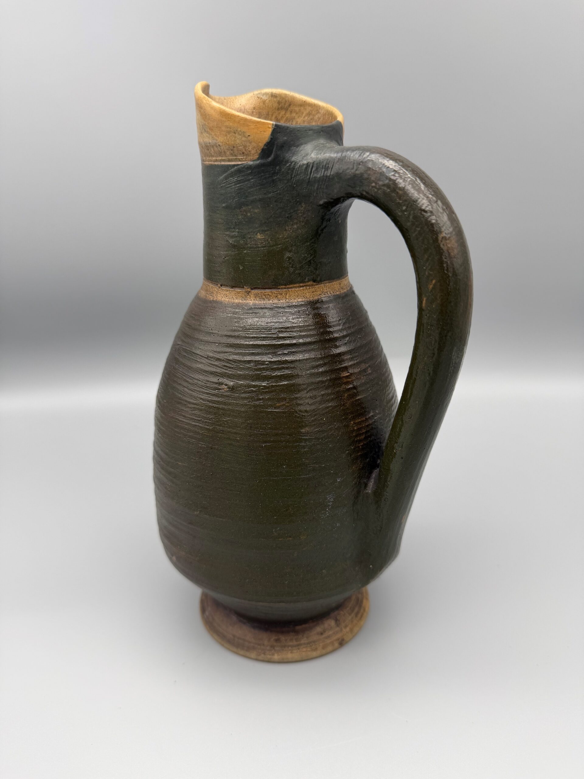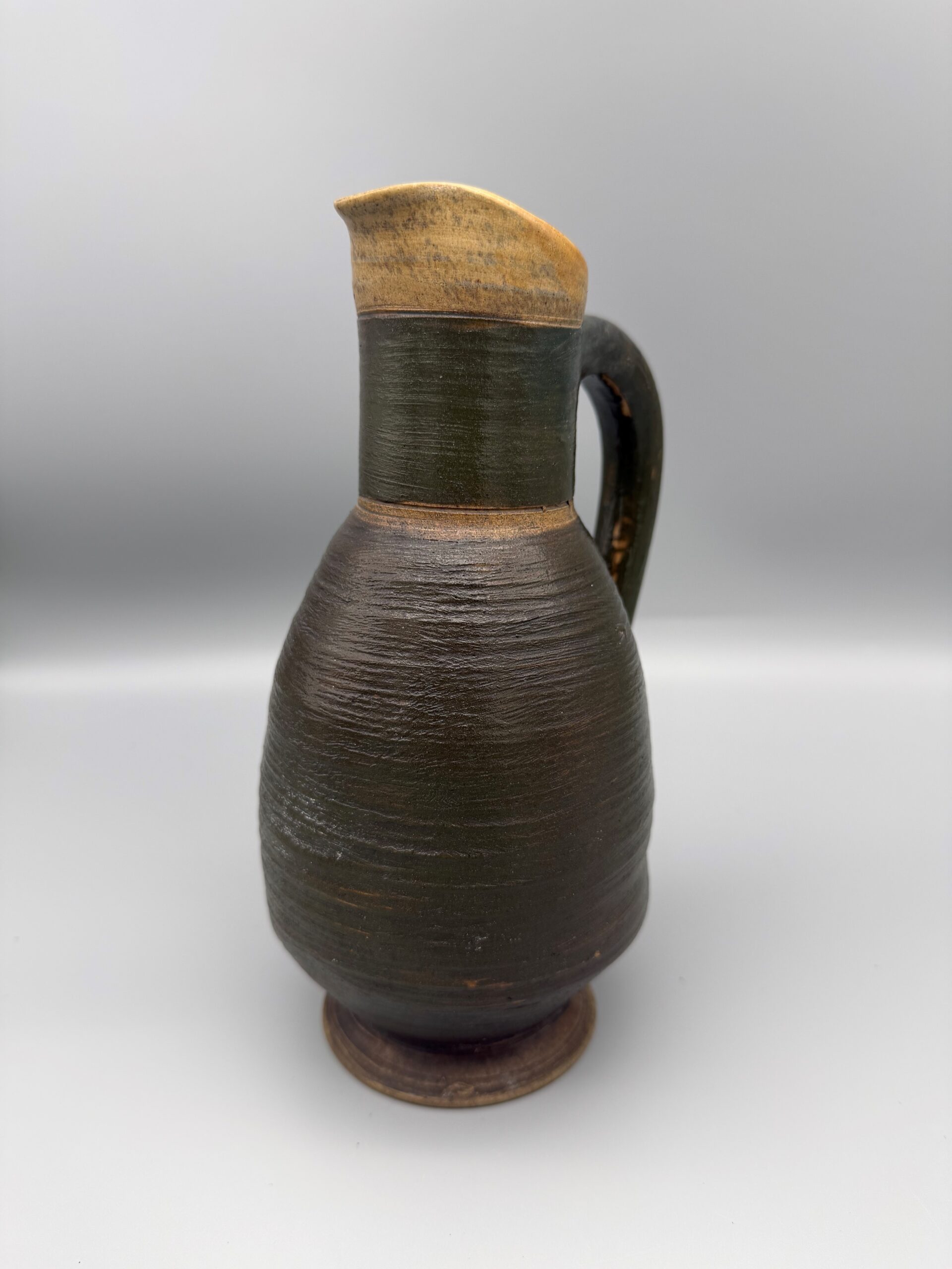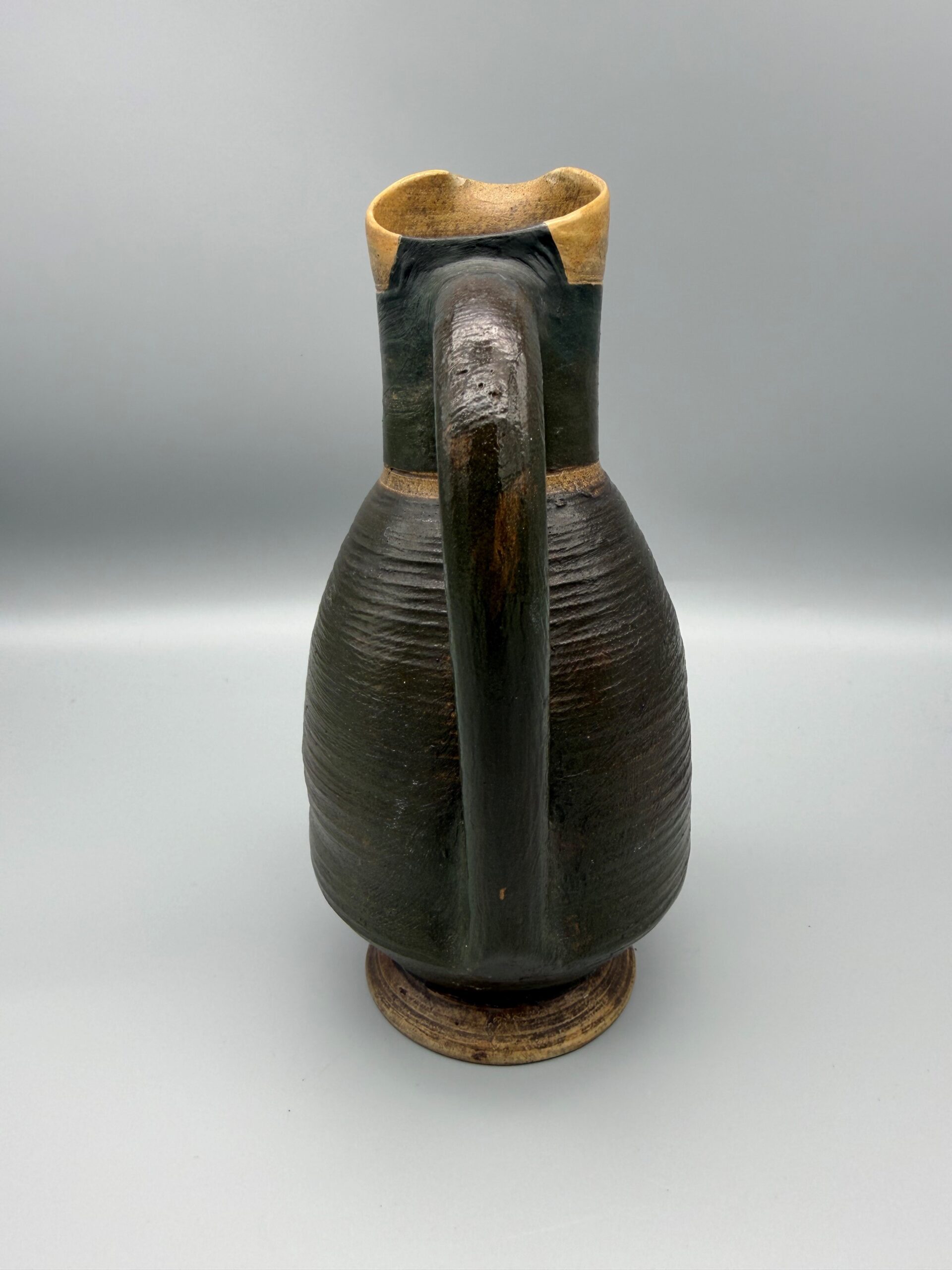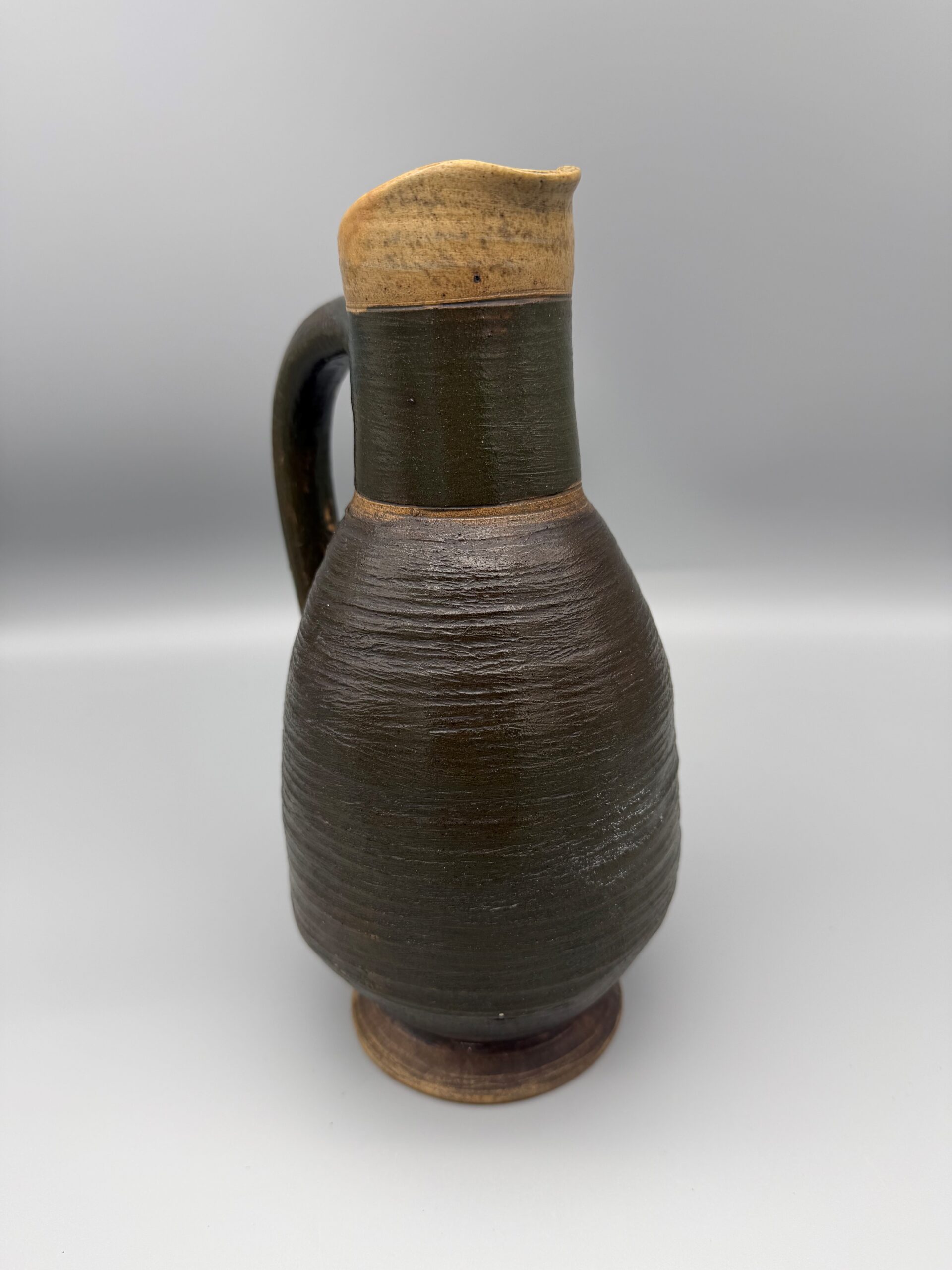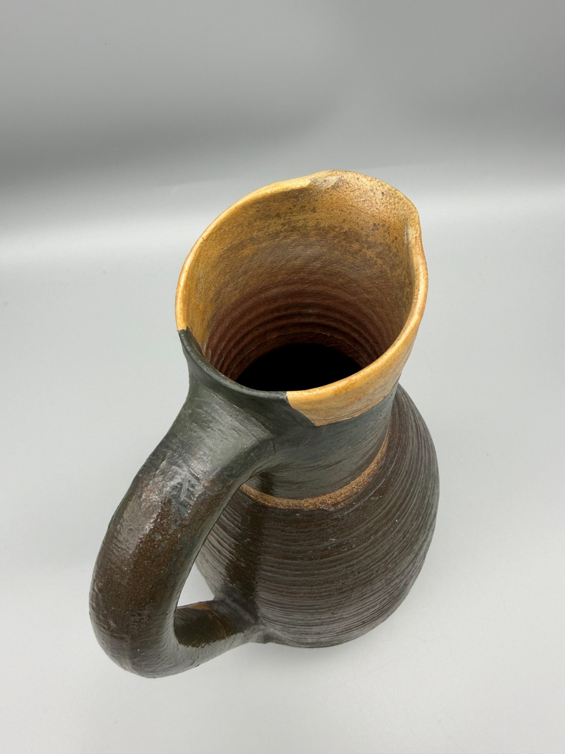 The jug is characterized by its tactile, heavily ribbed texture, a testament to its hand-thrown origins by eccentric brothers. A rich, dark olive-brown salt glaze dominates the meticulously textured body and handle. This deep, lustrous finish contrasts strikingly against the lighter, biscuit-toned clay left exposed at the rim, the interior, a thin defining band at the shoulder, and the foot. This earthy, two-tone palette masterfully accentuates the horizontal throwing lines that encircle the entire vessel.